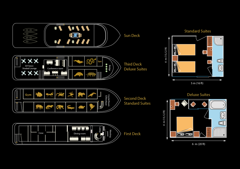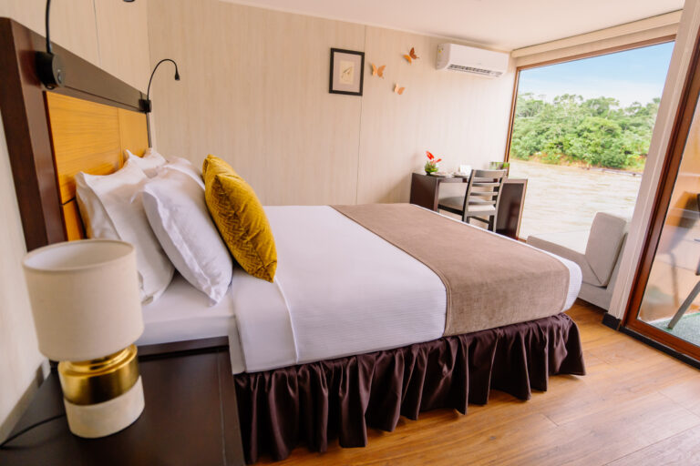 On board, you’ll find elegant and welcoming social spaces, including a panoramic dining room, a bar-lounge, an al fresco lounge, and an open observation deck where you can unwind as the Amazon’s scenery drifts by. The ship also features two outdoor Jacuzzis on the sun deck for a unique jungle-view experience. Accommodations come in thoughtfully appointed suites, Standard Suites with river views and French balconies, and Deluxe Suites offering private balconies and enhanced amenities for added comfort.