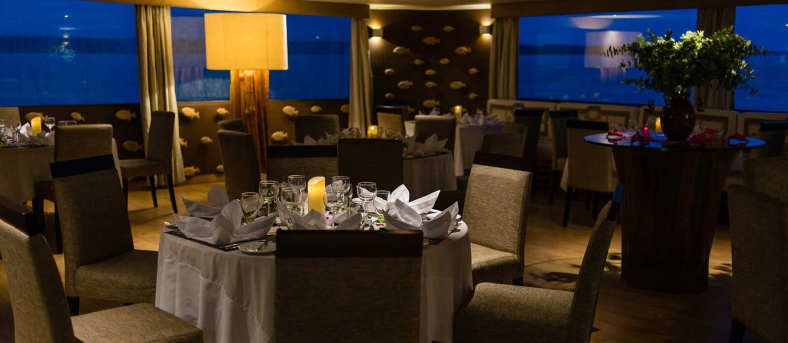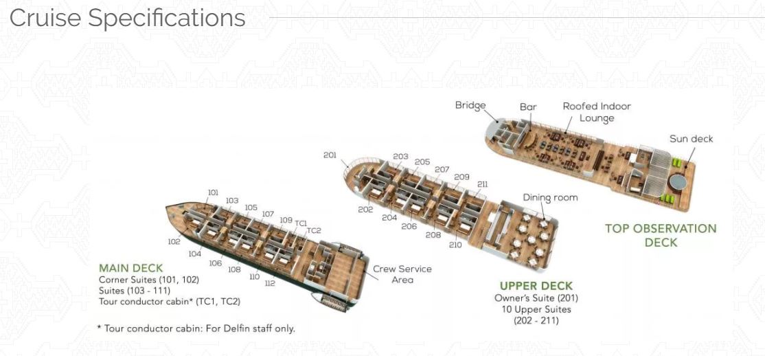 This Delfin III ship offers an immersive rainforest experience, a personalized service and the highest standards of luxury. The vessel has been fitted out beautifully, incorporating the finest details and handmade Peruvian craftwork. The Delfin III offers 22 suites with the highest levels of comfort for up to 44 passengers, making it the largest cruise. On the first deck, there are 8 Suites complete with floor-to-ceiling panoramic windows as well as 2 spacious Corner Suites facing the front of the ship. The second deck is comprised of 10 Upper Suites and the largest of all, the Owner’s Suite. The top deck features beautiful indoor and outdoor lounge areas, a sundeck with plunge pool, a spa and gym, and of course the bar.