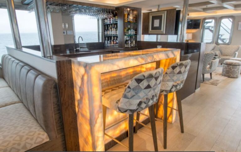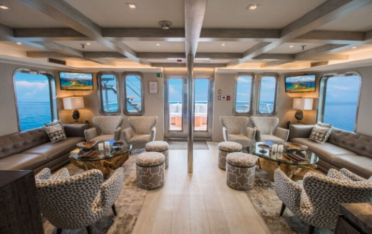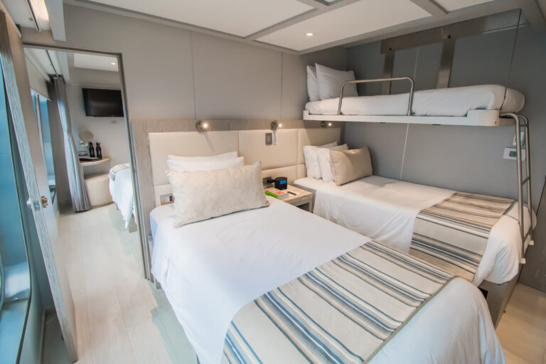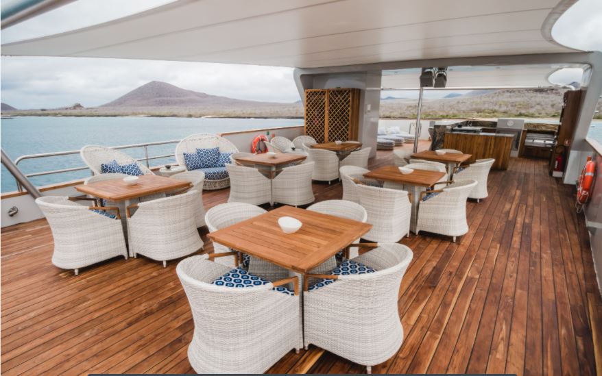On the sundeck, unwind on daybeds and chaise lounges or cool off in the outdoor shower after enjoying an al fresco lunch or smoky barbecue and drinks from the wet bar. There’s also a Jacuzzi hot tub—perfect for sunny afternoons— and shaded areas for escaping the equatorial sun.  The onboard experience is matched only by the incomparable beauty of the islands you will visit.