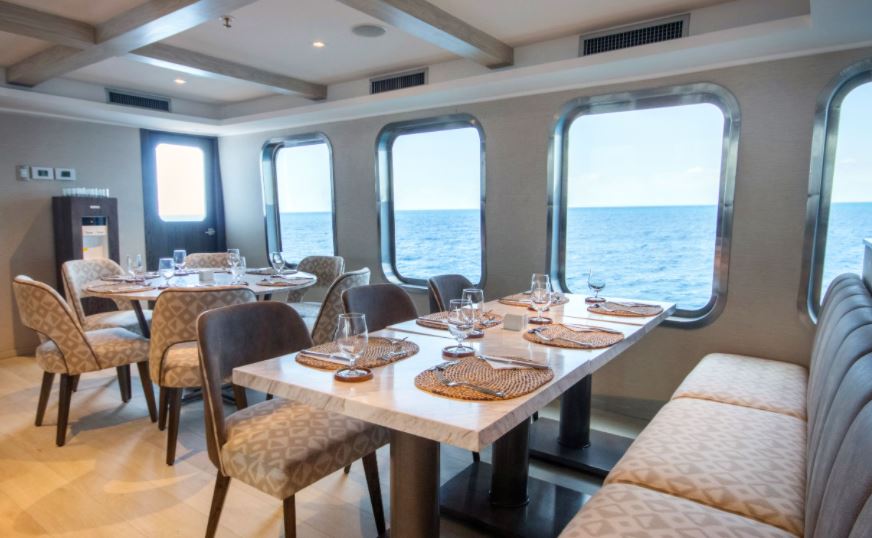 The ships’ interior social areas also include a comfortable lounge for evening briefings. A scholarly library features shelves filled with texts dedicated to the exploration of the Galápagos Islands and the ground breaking works of Charles Darwin. Dine at marble-top tables in our dining room. At the stylish bar, mingle with guests over hand-crafted cocktails, red, white and sparkling wines, local beer and fresh juices.