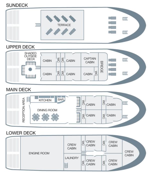 The new Yolita II is a beautiful and relaxing motor yacht that offers a delightful atmosphere in her 8 comfortable and spacious fully air conditioned cabins, all of them with lower beds and private bathrooms. Four twin cabins are located on the Main deck, and five cabins are located on the upper deck. Other features include ample resting area in the sun deck & the social areas such as: dining room, comfy lounge area, bar, large screen TV, DVD player, library, and selection of table games.